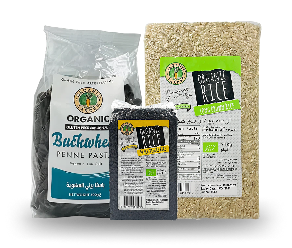 - Long Brown Rice 1kg, Buckwheat Penne Pasta 300g, Black Rice 500g Organic Long Brown Rice, soft with a slightly sticky texture. Gluten-free Buckwheat Penne, a healthy pasta alternative. Premium Black Rice, nutrient-rich and vegan-friendly. Ideal for balanced, plant-based meals. Wholesome grains for everyday cooking..